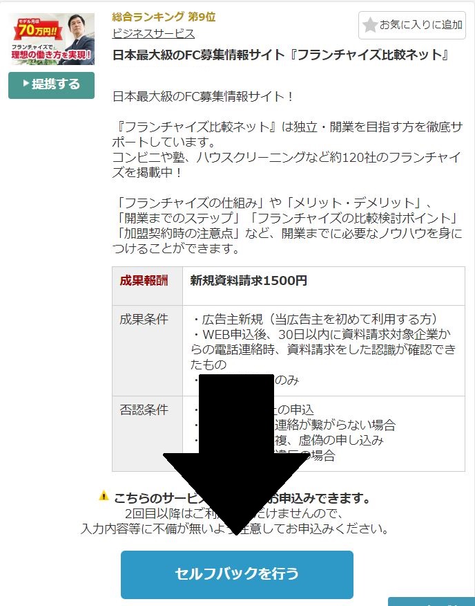 3. セルフバック用の新しいページがひらきます。検索窓に「フランチャイズ比較ネット」と入力して、検索をクリック。