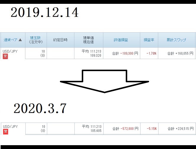 この3か月でスワップ金利は16万から約22万へと変化しています。引き算すると、3ヶ月間で64460円ほどたまっていることになりますね。1年だと単純計算で25万円たまる予定です。