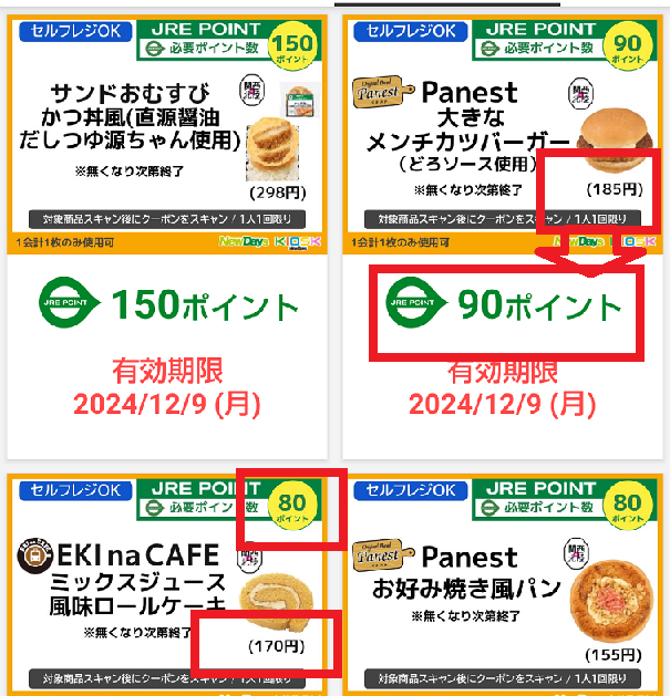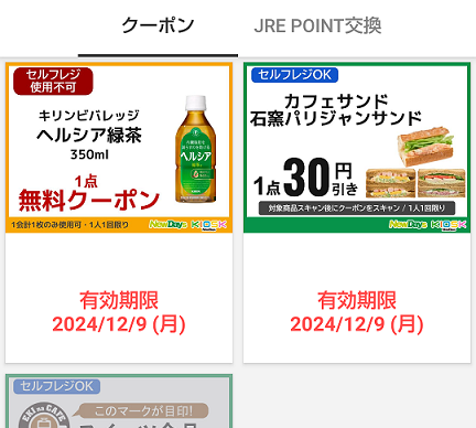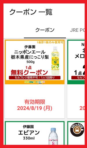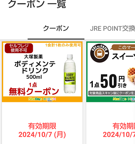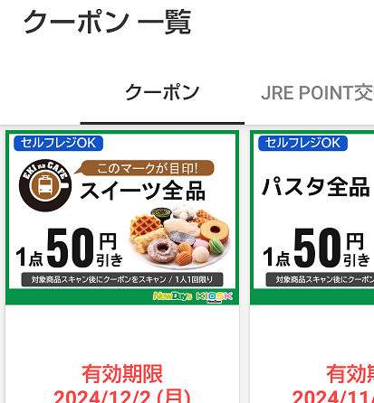 ニューデイズで買い物するときは、JREポイントが少ないことに落胆する前に、まずこのクーポン券をみて、何を買えるのか考えるというのがいいだろう。