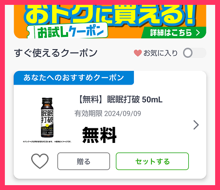 ファミマのアプリから無料の眠眠打破のクーポンきたー。