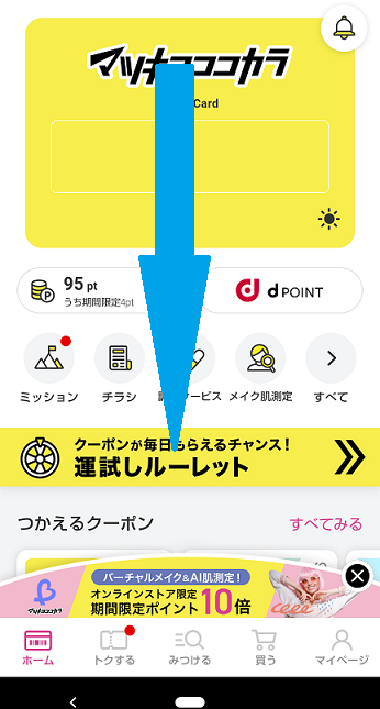 マツキヨアプリはこの矢印のところから、毎日二回ルーレットできるんですよ。