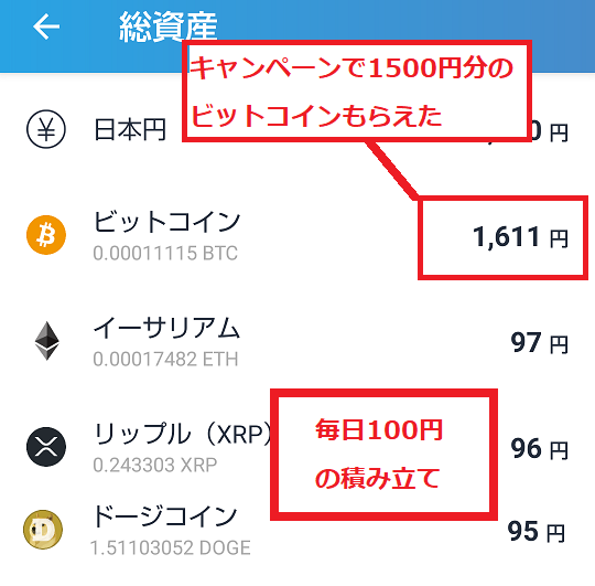 さらにキャンペーンの1500円分のビットコインも受け取れました。