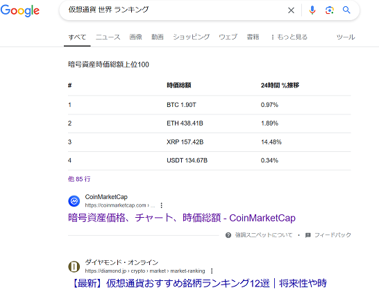 ちなみに↓このサイトでは、一位のビットコインの時価総額は2024.11.30で285兆円だった。