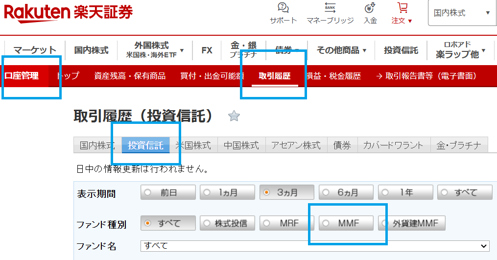 MMFの利子(分配金)の確認方法は、口座管理 → 取引履歴 → 投資信託 → MMF。