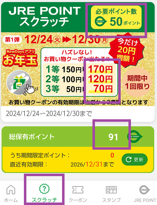 50ポイントでスクラッチができて、はずれなしで、最低が70ポイントのプレゼント。