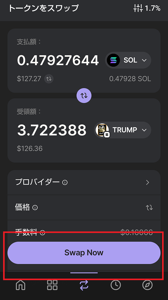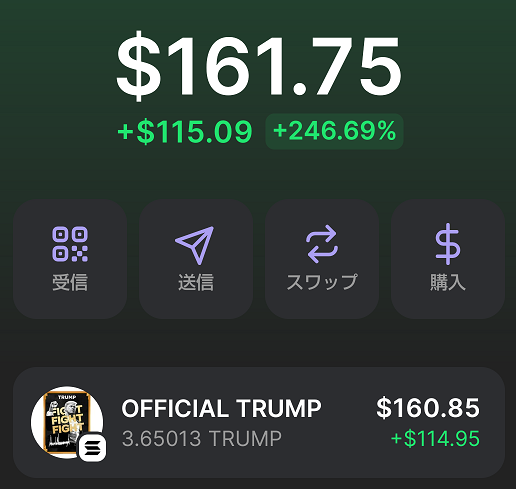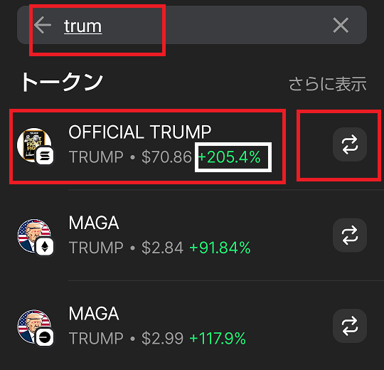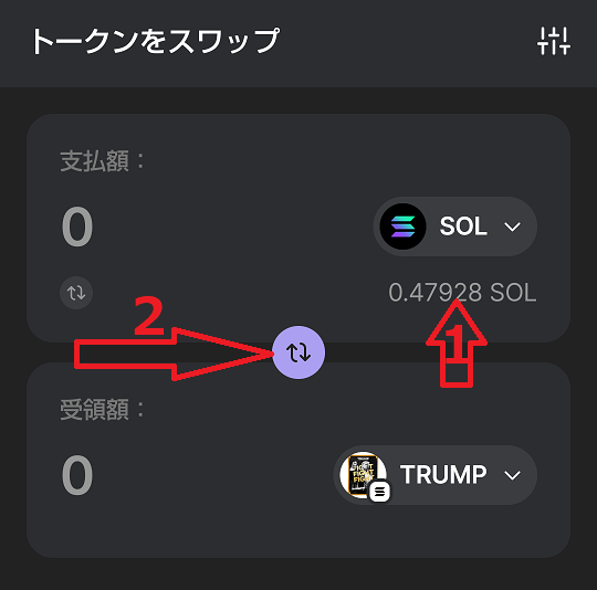 ・アプリphantomでSOLを受け取ったら、SOLから「OFFICIAL TRUMP」へ交換(スワップ)します。