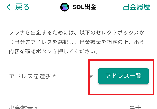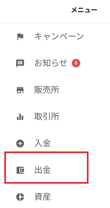 アプリphantomがインストールできたら、ビットバンクのアプリにもどり、メニューから出金を選び、