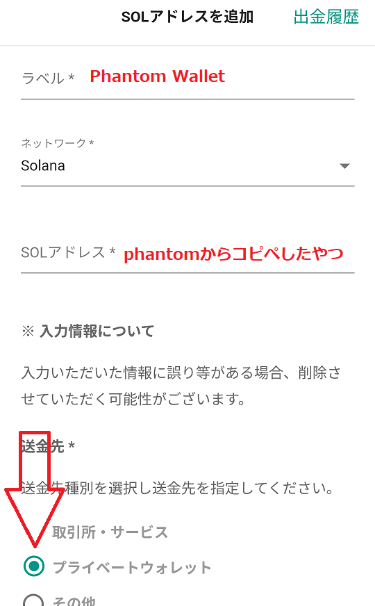 ラベルに「Phantom Wallet」、ネットワークを「Solana」、SOLアドレスにはphantomからゲットしたアドレスをペースト(すぐこのあと説明します)、送金先は「プライベートウォレット」。あとは「確認」をおせばOK。(下図)