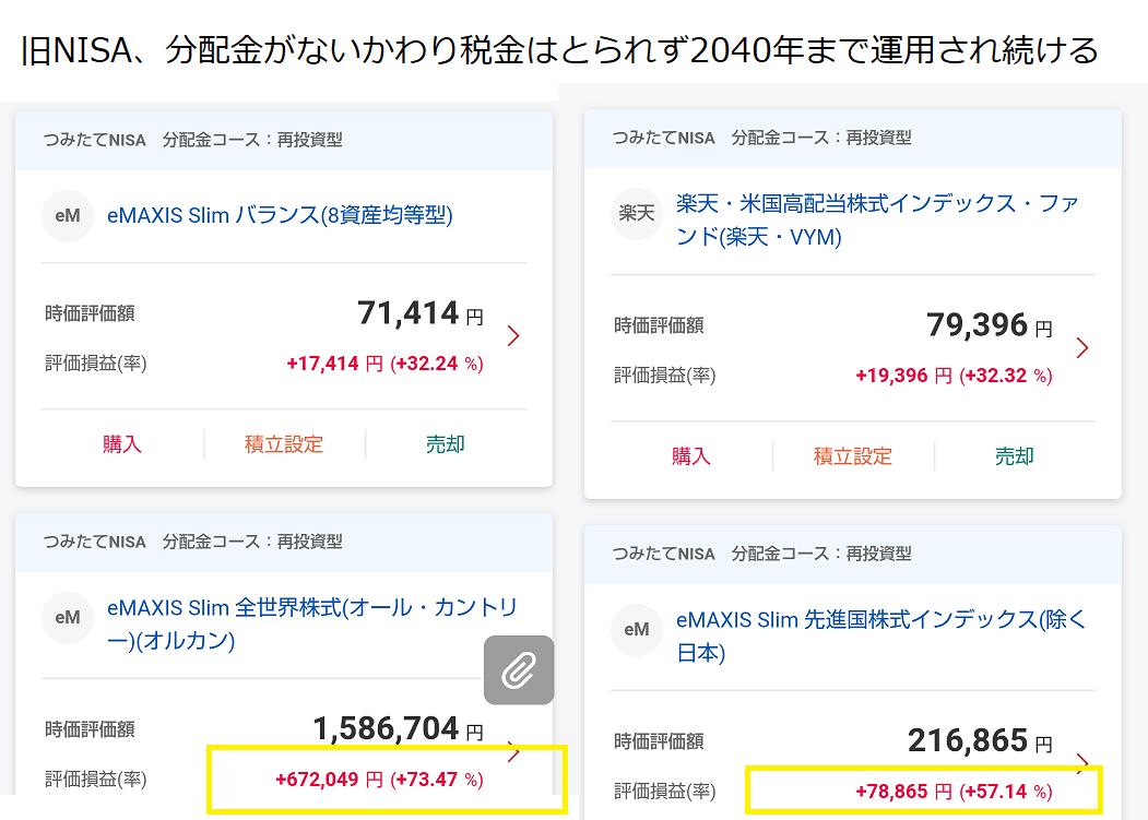つまり下手にいろいろやるよりも、オルカン一択、しかもNISAでやるのが最強なのだ。おれは旧NISAのときはこれをちゃんとやってて、いまこれ。