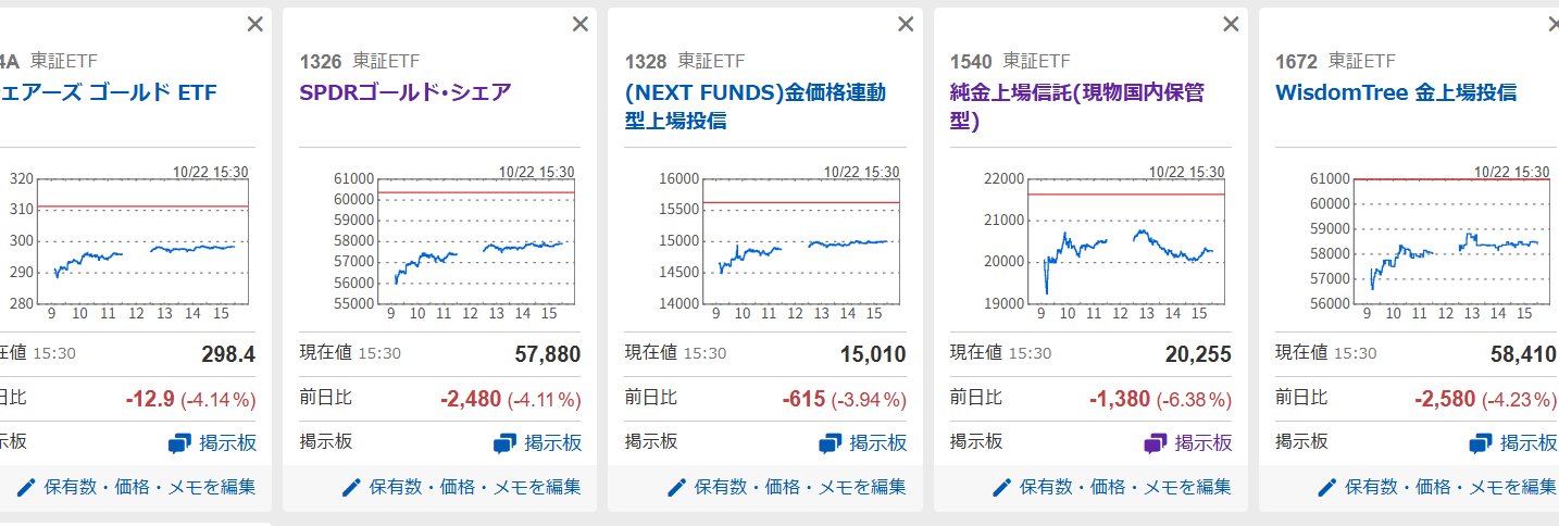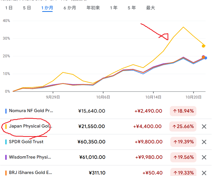 ↑ほかのゴールドETFが軒並み2.8%くらいあげているのに、ここだけ下がったのだ。