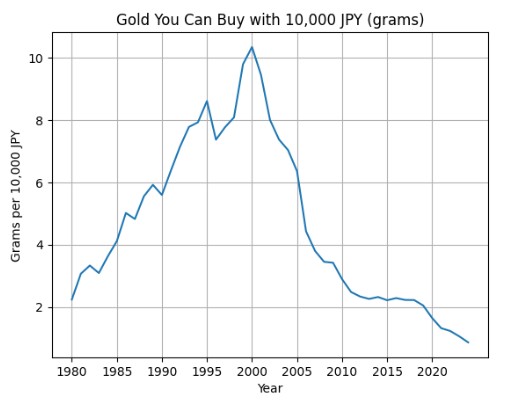 わかりやすいように「1万円で買える金の量(グラム)」の推移をグラフでみてみると、