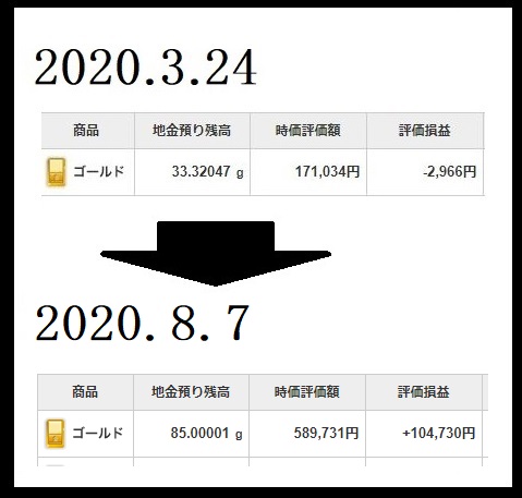 マネックス証券でやってるゴールドへの投資。約5か月間の変化。 2020/8/10 2020/8/10 FX 以前も言ったように、ネット界隈で超有名なcis神は、ゴールドが2倍になると予想している。 twitter.com/cissan_9984/status/1212957098008383488 さて俺のマネックス証券のゴールドの口座をみてみましょう。 ゴールドは確かに配当金などはないけど、いい感じで上がっているね。 でももう20%くらいの含み益になってしまっている。本当に二倍になるのだろうか。こわくて、買い増しできない。 SBI証券でも、金プラチナの取引やってますね。