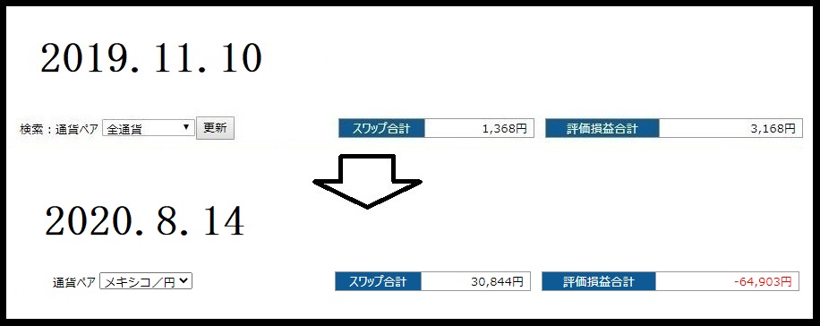 スワップ金利は、この10ヶ月間で1368円から30884円になっているので、約29516円ついていますね。このポジション数だと一か月2952円のスワップポイントがつき、一年間で35419円のスワップポイントがつく計算ですね。