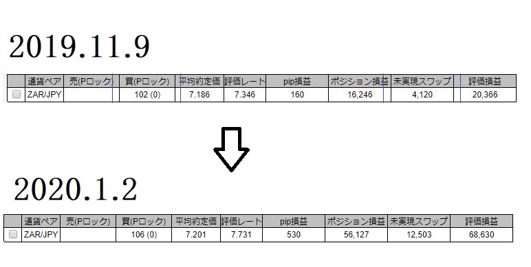 この口座ではスワップ金利が2000円たまるたびに、あらたに南アドル1000通貨の買いポジションをたてるんだ。